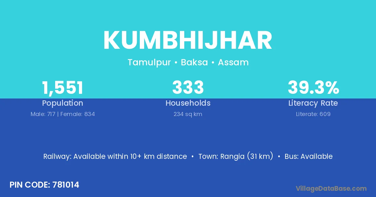 Rangia (31 km) is the nearest town to Kumbhijhar village for major economic activities and is located approximately 31 km away.