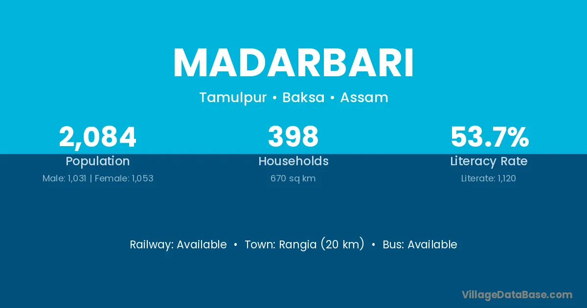 Rangia (20 km) is the nearest town to Madarbari village for major economic activities and is located approximately 20 km away.