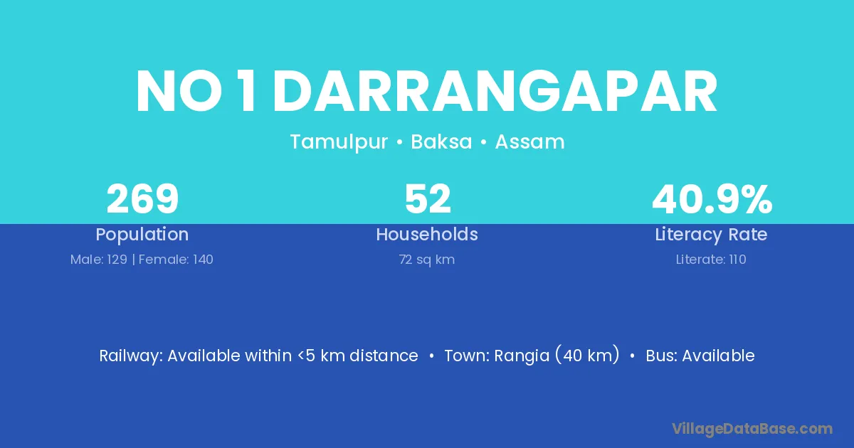 No 1 Darrangapar village has a total population of 269 people, of which 129 are males and 140 are females.