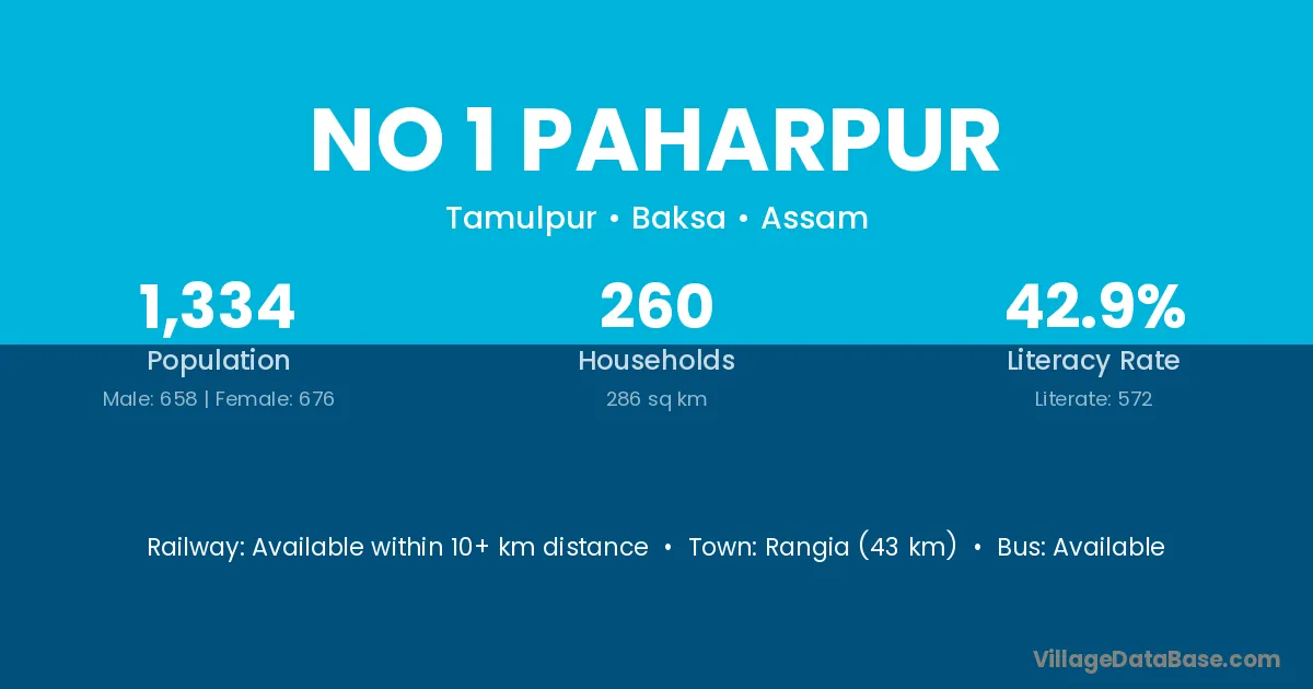 Rangia (43 km) is the nearest town to No 1 Paharpur village for major economic activities and is located approximately 43 km away.