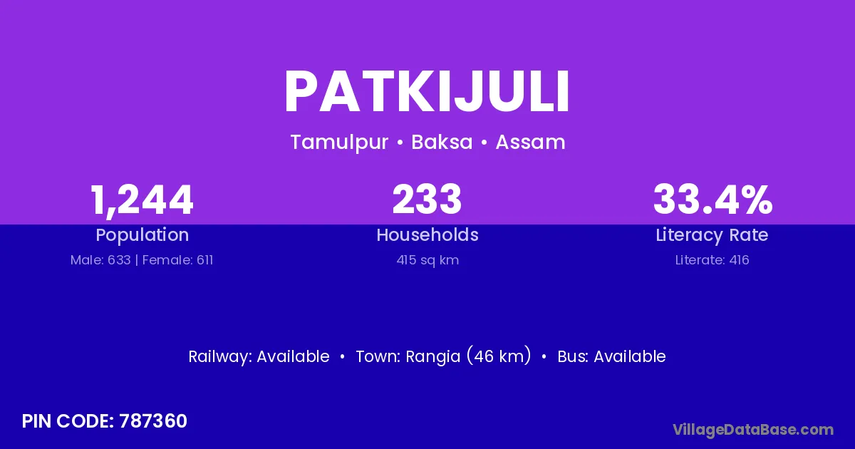 Rangia (46 km) is the nearest town to Patkijuli village for major economic activities and is located approximately 46 km away.
