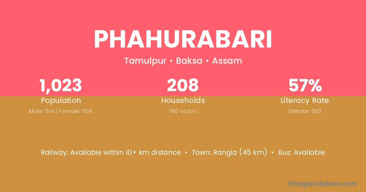 Rangia (45 km) is the nearest town to Phahurabari village for major economic activities and is located approximately 45 km away.