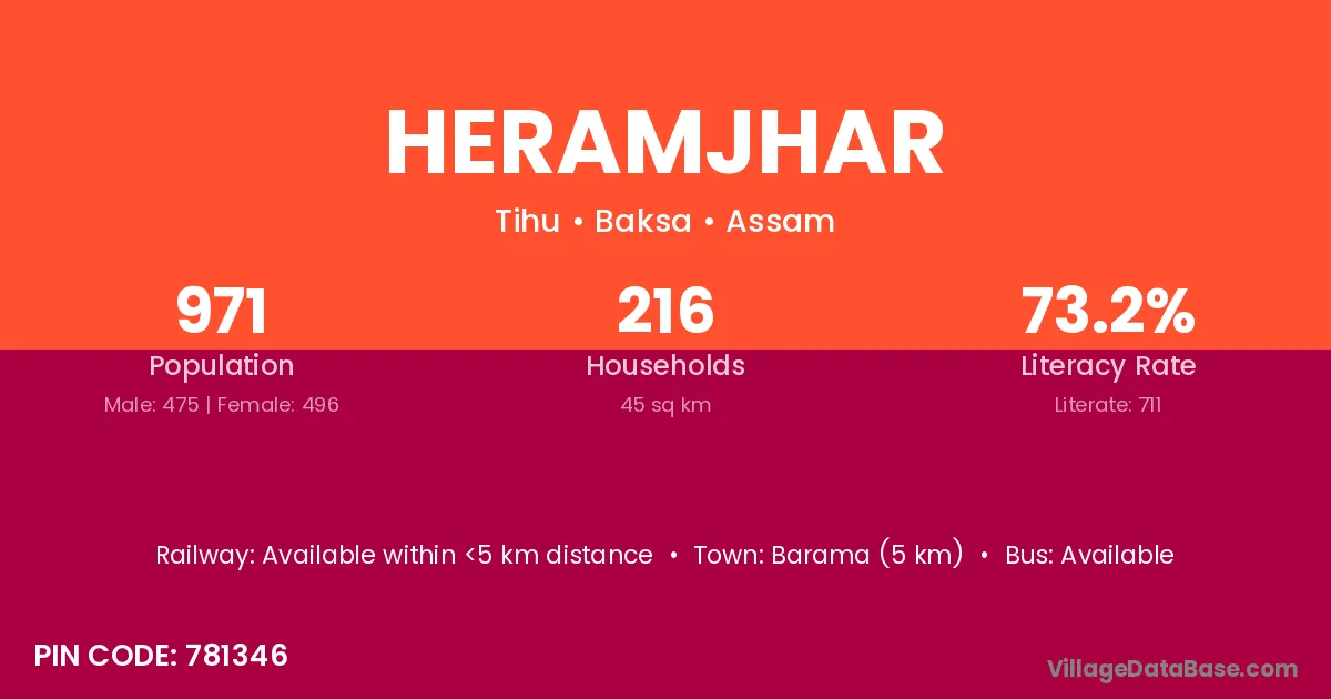Barama (5 km) is the nearest town to Heramjhar village for major economic activities and is located approximately 5 km away.