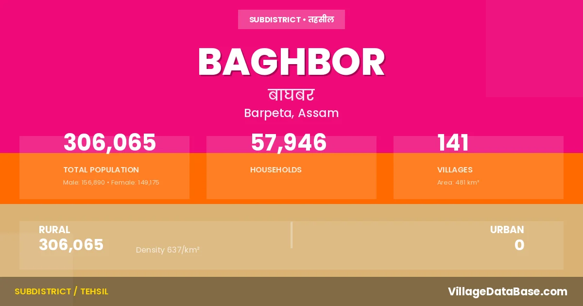 According to the 2011 census The total area of Baghbor Subdivision is 481 km², with a population of 306065 people. The population density is 637 inhabitants per square kilometre, and there are approximately 57946 houses in the sub district.