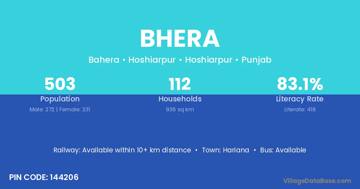 Bhera village has a total population of 3,571 people, of which 1,859 are males and 1,712 are females.