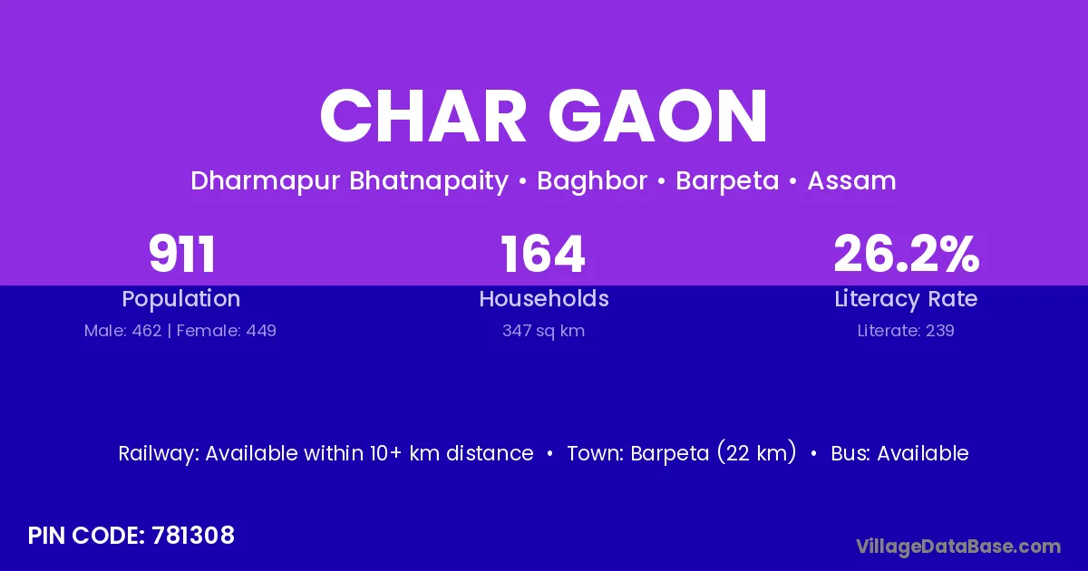 Barpeta (22 km) is the nearest town to Char Gaon village for major economic activities and is located approximately 22 km away.