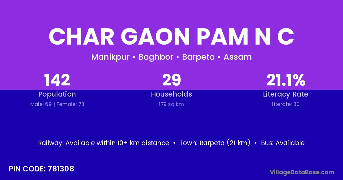 Char Gaon Pam N C village has a total population of 142 people, of which 69 are males and 73 are females.
