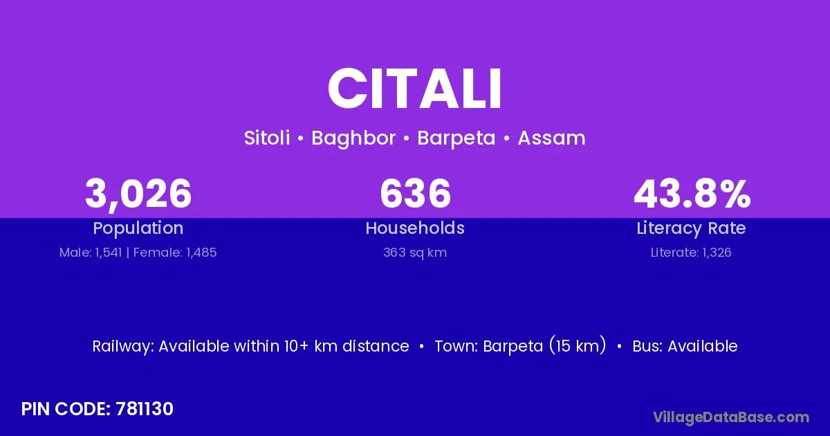 Barpeta (15 km) is the nearest town to Citali village for major economic activities and is located approximately 15 km away.