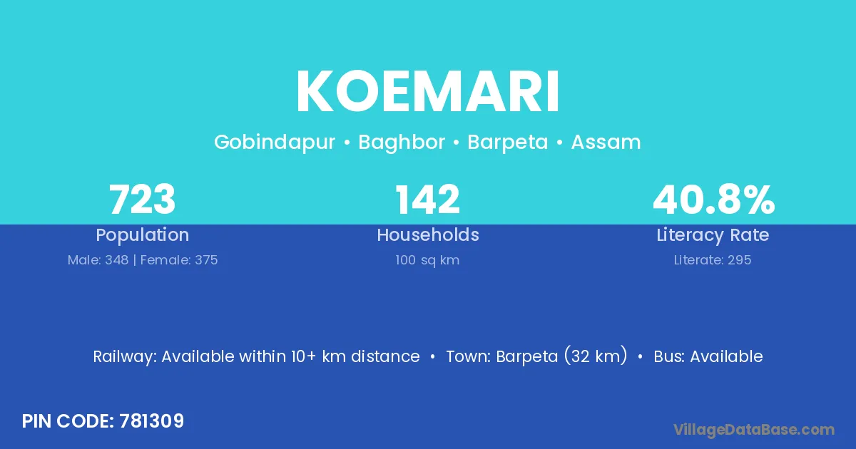 Barpeta (32 km) is the nearest town to Koemari village for major economic activities and is located approximately 32 km away.