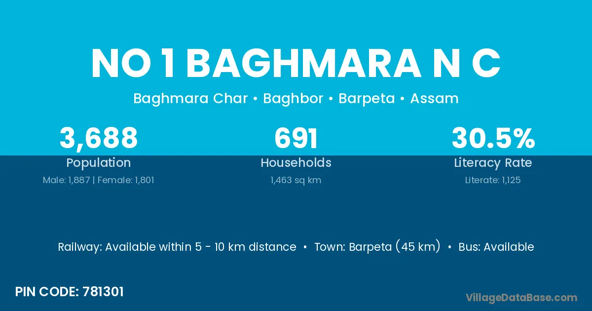 Barpeta (45 km) is the nearest town to No 1 Baghmara N C village for major economic activities and is located approximately 45 km away.