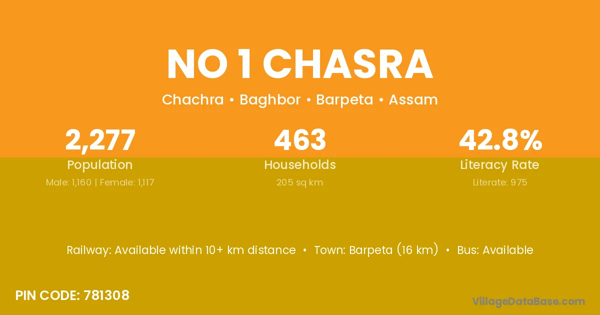 Barpeta (16 km) is the nearest town to No 1 Chasra village for major economic activities and is located approximately 16 km away.