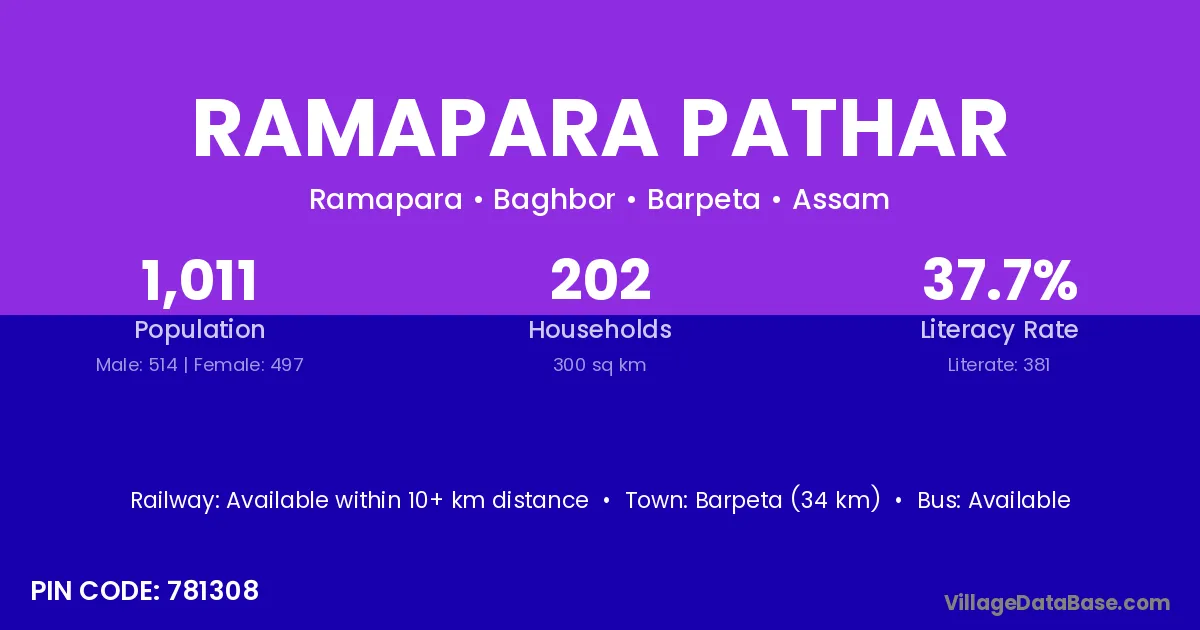 Barpeta (34 km) is the nearest town to Ramapara Pathar village for major economic activities and is located approximately 34 km away.