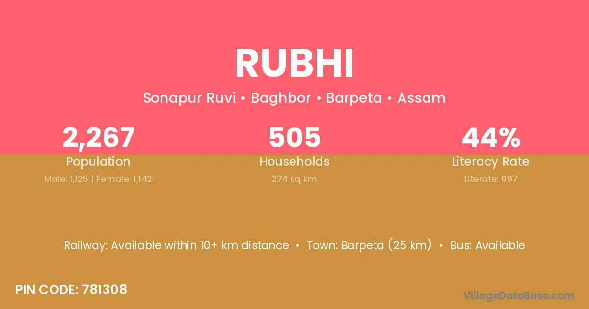 Barpeta (25 km) is the nearest town to Rubhi village for major economic activities and is located approximately 25 km away.