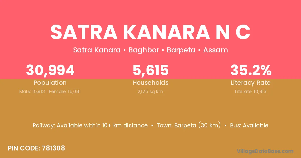 Barpeta (30 km) is the nearest town to Satra Kanara N C village for major economic activities and is located approximately 30 km away.