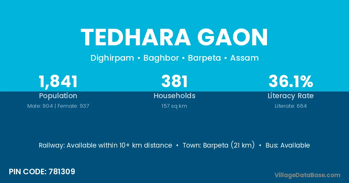 Barpeta (21 km) is the nearest town to Tedhara Gaon village for major economic activities and is located approximately 21 km away.