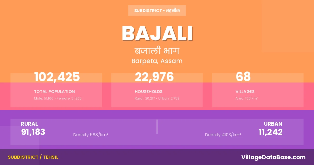 According to the 2011 census The total area of Bajali Subdivision is 158 km², with a population of 102425 people. The population density is 649 inhabitants per square kilometre, and there are approximately 22976 houses in the sub district.