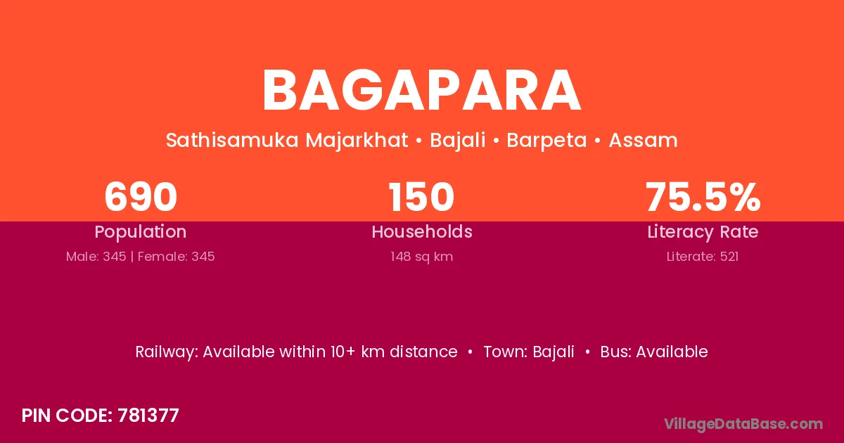 Bagapara village has a total population of 690 people, of which 345 are males and 345 are females.