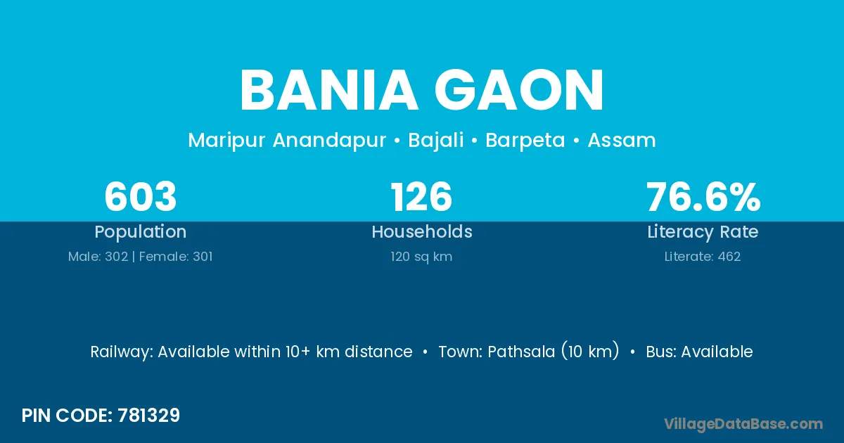 Bania Gaon village has a total population of 603 people, of which 302 are males and 301 are females.