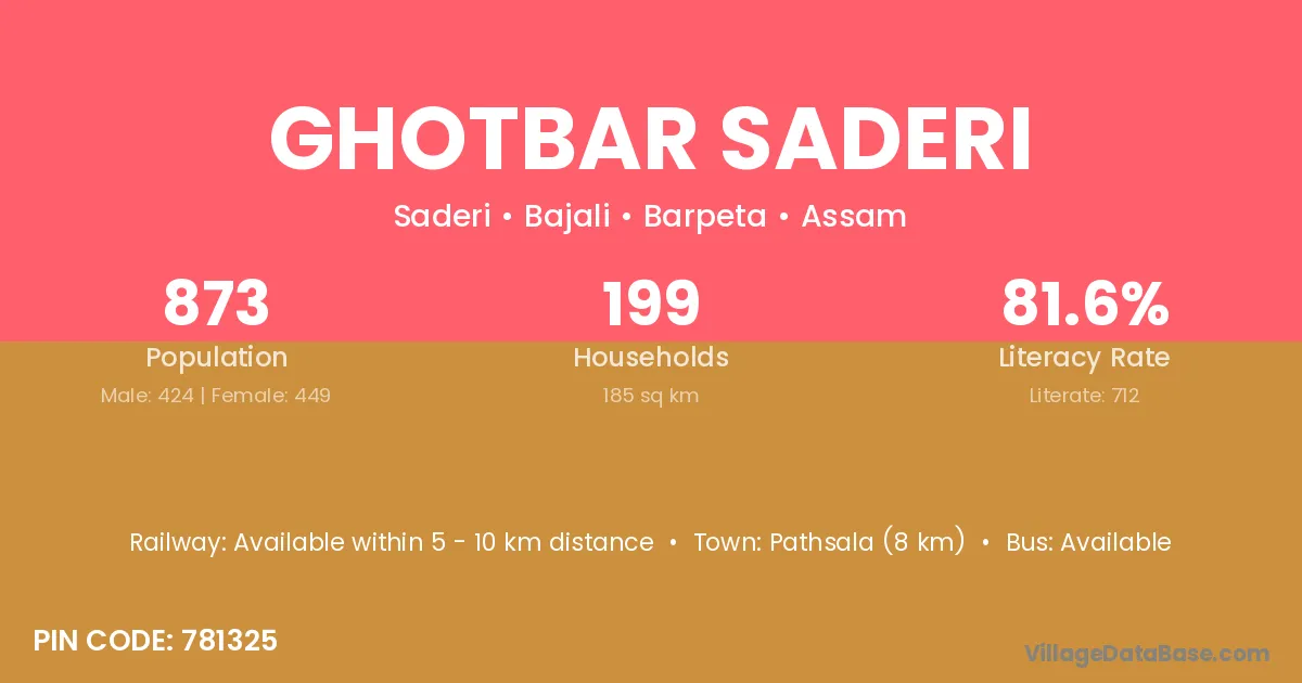 Pathsala (8 km) is the nearest town to Ghotbar Saderi village for major economic activities and is located approximately 8 km away.