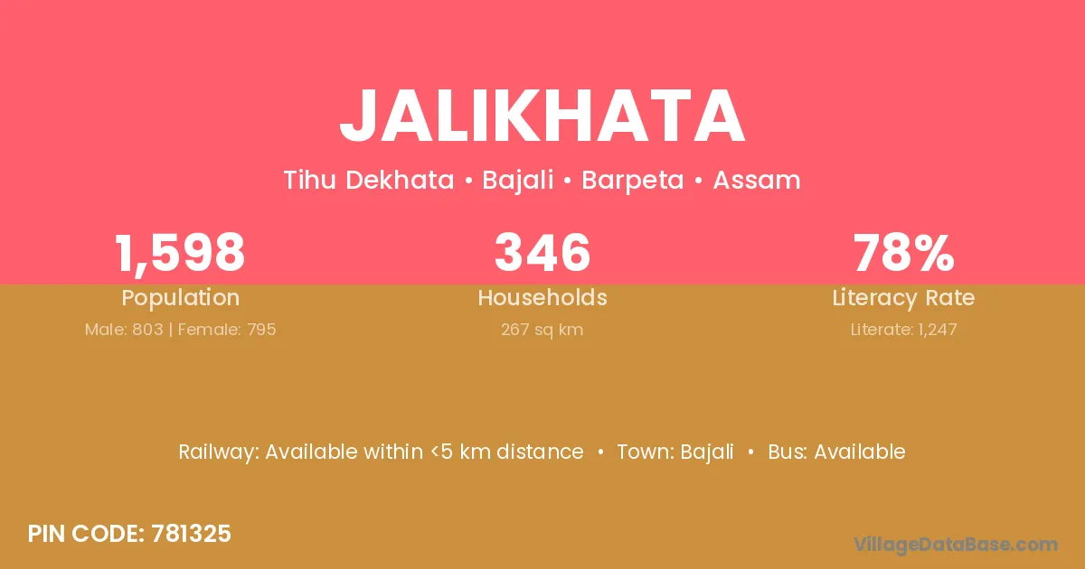 Jalikhata village has a total population of 1,598 people, of which 803 are males and 795 are females.