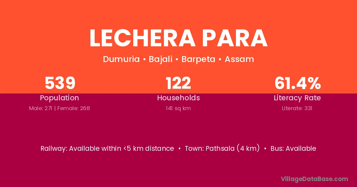 Pathsala (4 km) is the nearest town to Lechera Para village for major economic activities and is located approximately 4 km away.