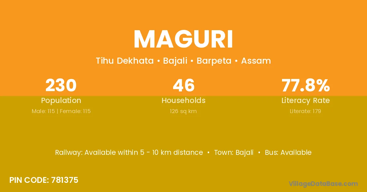 Maguri village has a total population of 230 people, of which 115 are males and 115 are females.