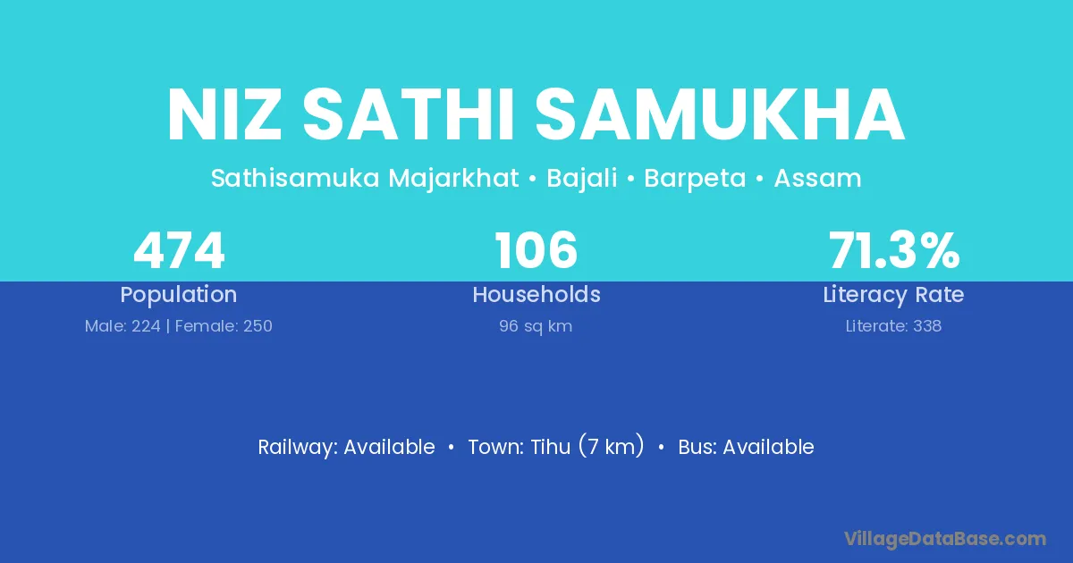 Niz Sathi Samukha village has a total population of 474 people, of which 224 are males and 250 are females.