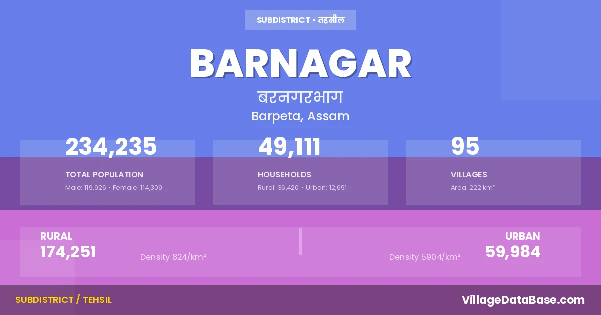 Barnagar is a town and Subdivision in the Barpeta district of the Assam. In India, a Subdivision is a subdivision of a district responsible for the administration and revenue collection of a specific area within the district. Subdivisions play a crucial role in the local governance structure, contributing significantly to the development and administration of their communities.