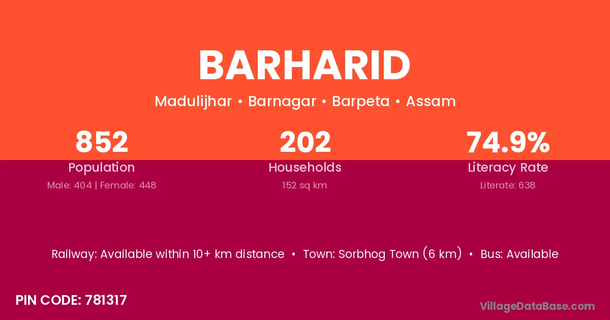 Sorbhog Town (6 km) is the nearest town to Barharid village for major economic activities and is located approximately 6 km away.