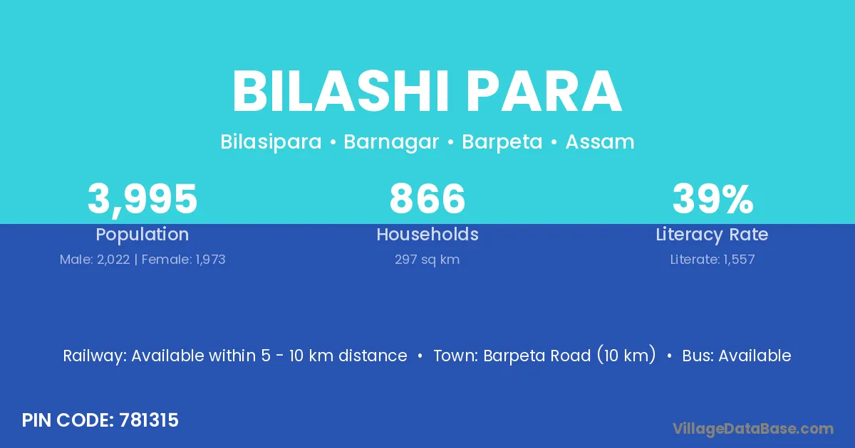 Barpeta Road (10 km) is the nearest town to Bilashi Para village for major economic activities and is located approximately 10 km away.