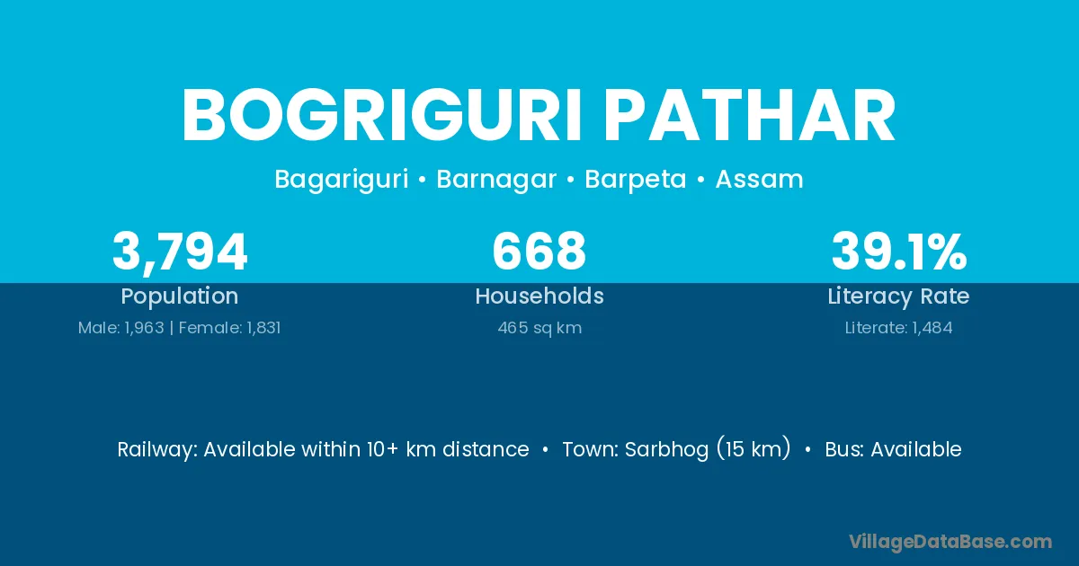 Bogriguri Pathar village has a total population of 3,794 people, of which 1,963 are males and 1,831 are females.