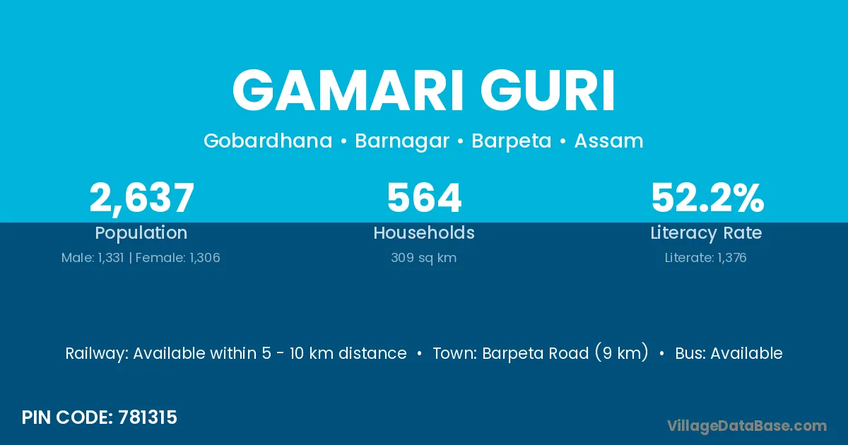 Barpeta Road (9 km) is the nearest town to Gamari Guri village for major economic activities and is located approximately 9 km away.