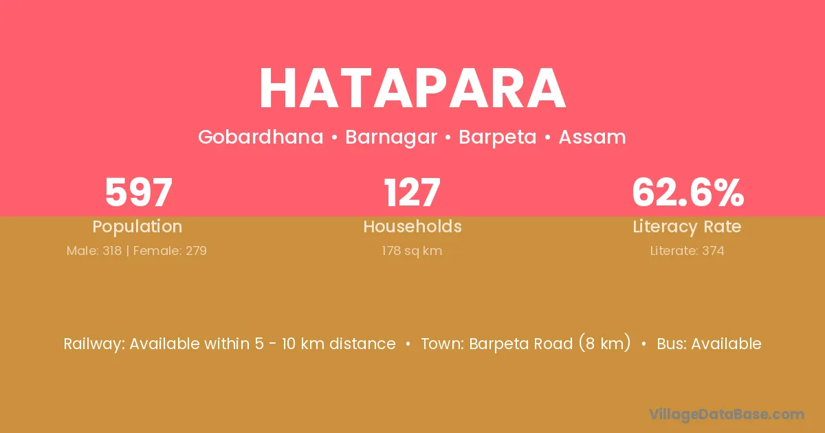 Barpeta Road (8 km) is the nearest town to Hatapara village for major economic activities and is located approximately 8 km away.