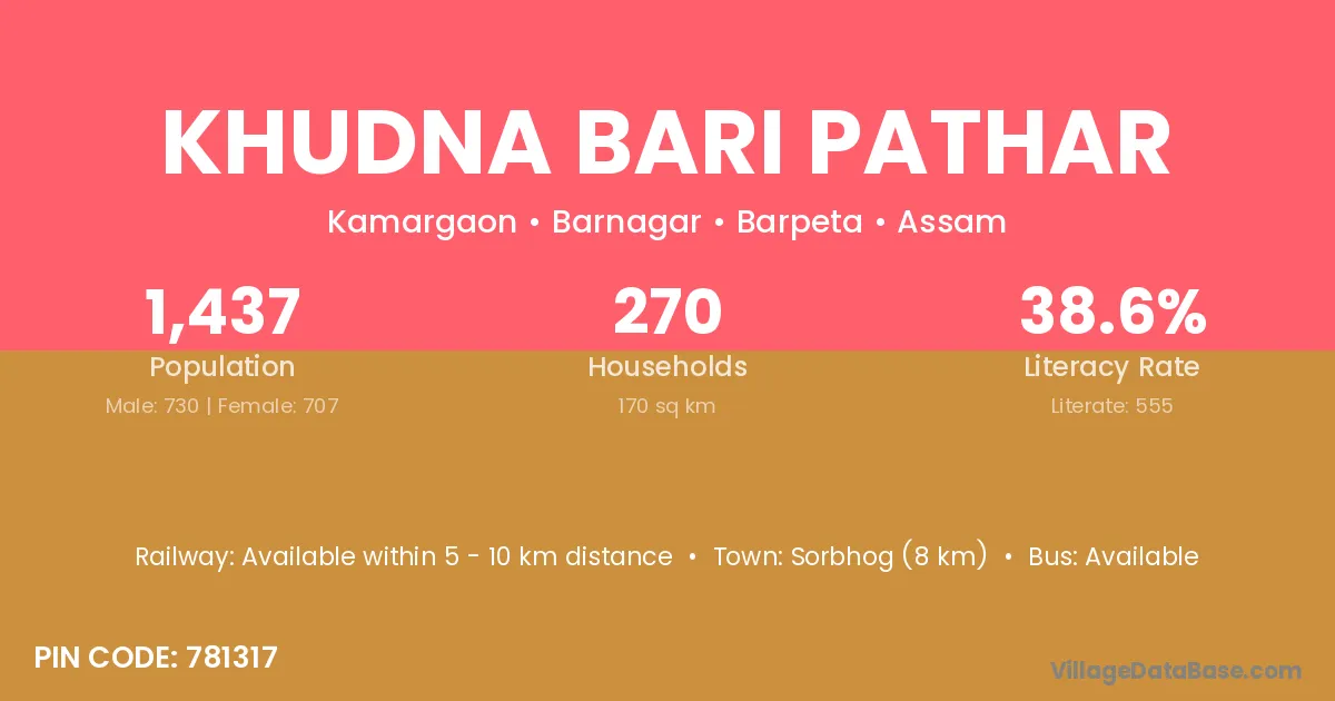 Sorbhog (8 km) is the nearest town to Khudna Bari Pathar village for major economic activities and is located approximately 8 km away.