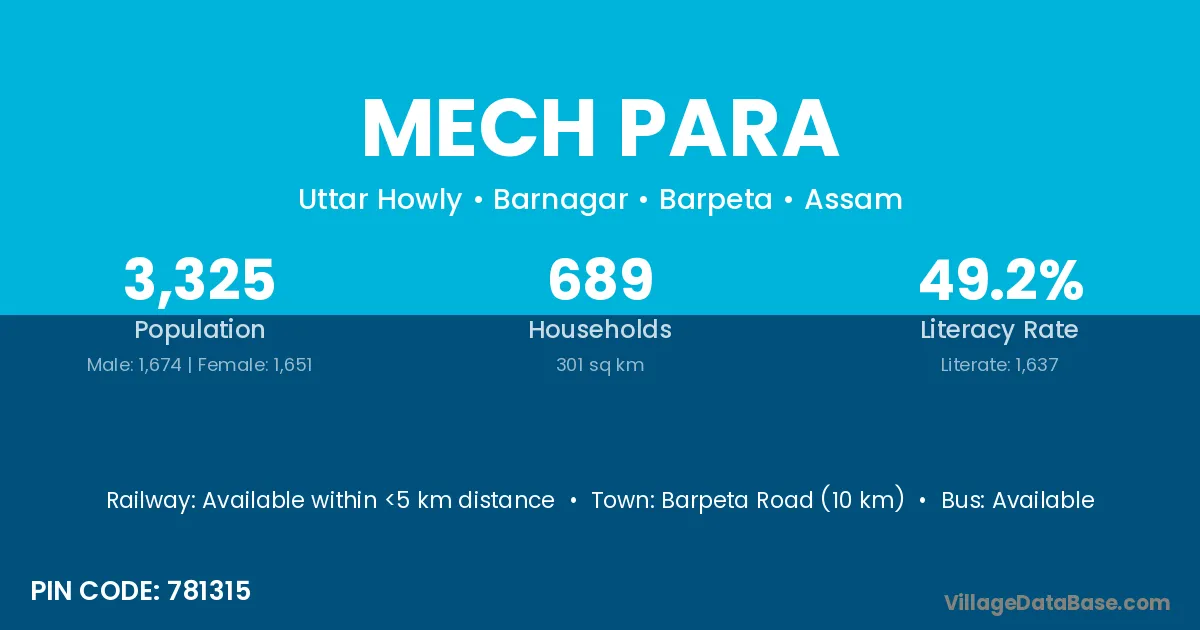 Barpeta Road (10 km) is the nearest town to Mech Para village for major economic activities and is located approximately 10 km away.