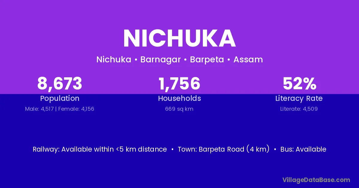 Barpeta Road (4 km) is the nearest town to Nichuka village for major economic activities and is located approximately 4 km away.