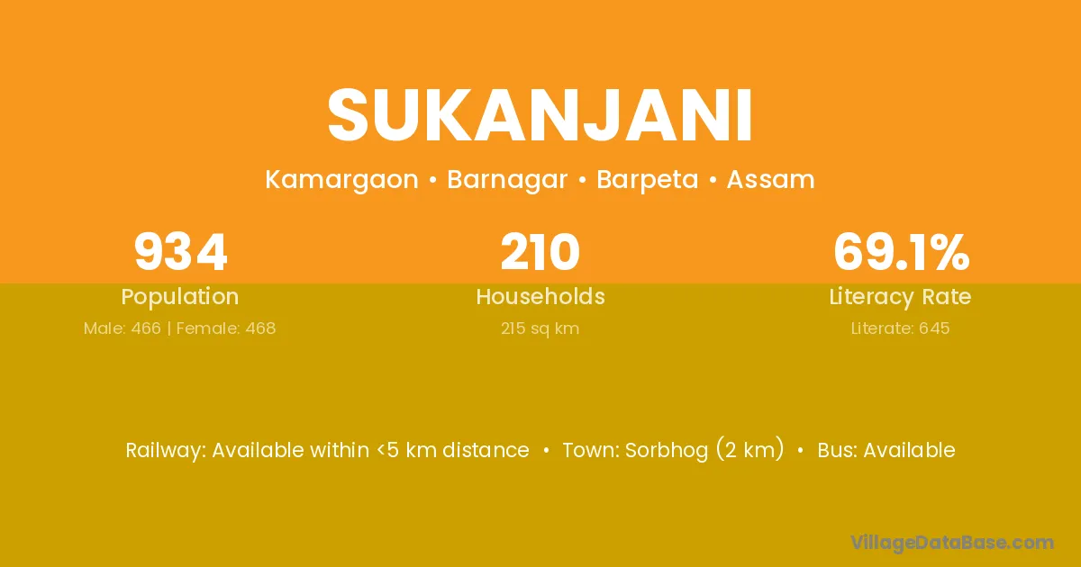 Sorbhog (2 km) is the nearest town to Sukanjani village for major economic activities and is located approximately 2 km away.