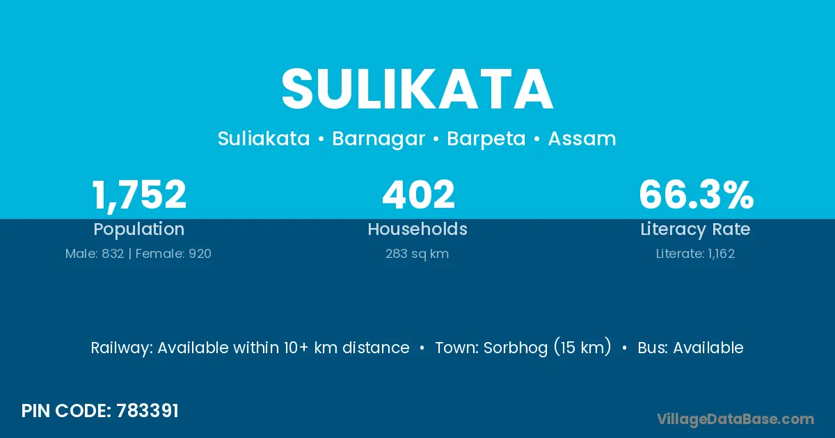 Sorbhog (15 km) is the nearest town to Sulikata village for major economic activities and is located approximately 15 km away.