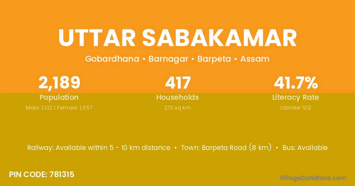 Barpeta Road (8 km) is the nearest town to Uttar Sabakamar village for major economic activities and is located approximately 8 km away.