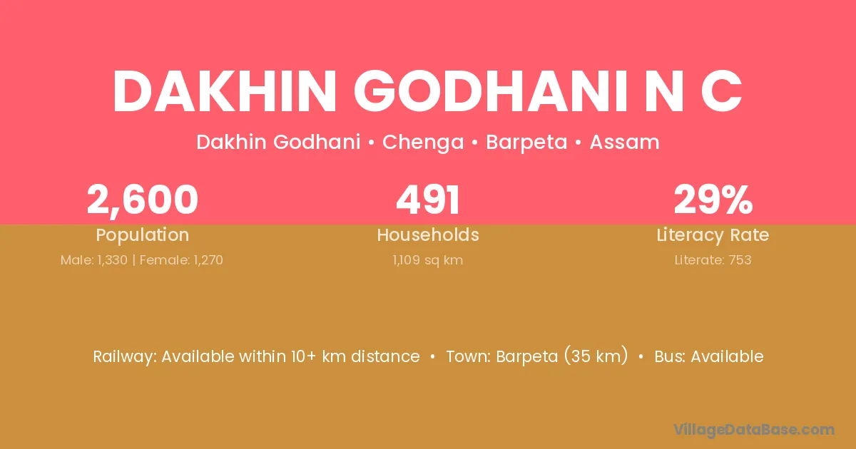 Barpeta (35 km) is the nearest town to Dakhin Godhani N C village for major economic activities and is located approximately 35 km away.
