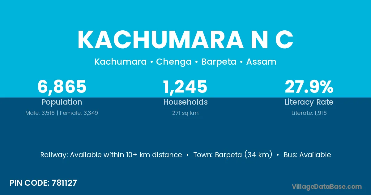 Barpeta (34 km) is the nearest town to Kachumara N C village for major economic activities and is located approximately 34 km away.