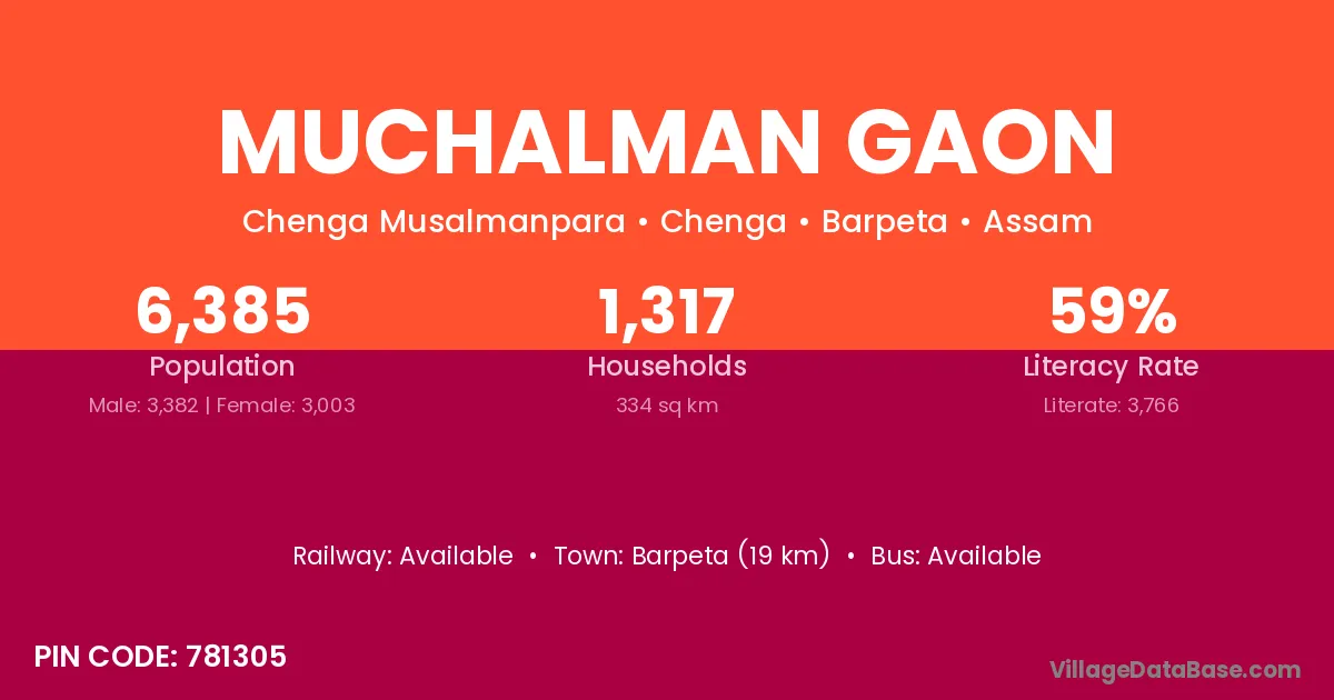 Muchalman Gaon village has a total population of 6,385 people, of which 3,382 are males and 3,003 are females.
