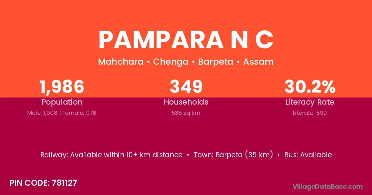 Barpeta (35 km) is the nearest town to Pampara N C village for major economic activities and is located approximately 35 km away.