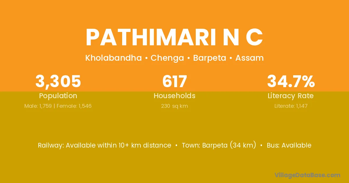 Barpeta (34 km) is the nearest town to Pathimari N C village for major economic activities and is located approximately 34 km away.