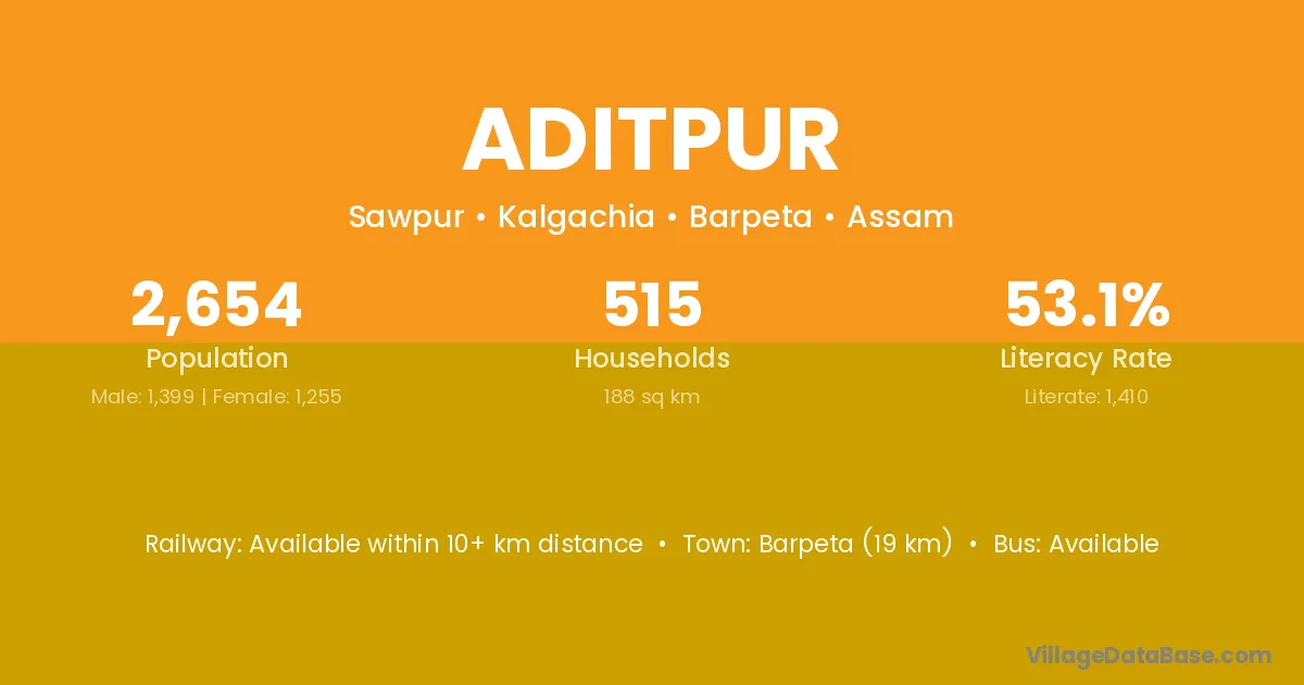 Barpeta (19 km) is the nearest town to Aditpur village for major economic activities and is located approximately 19 km away.