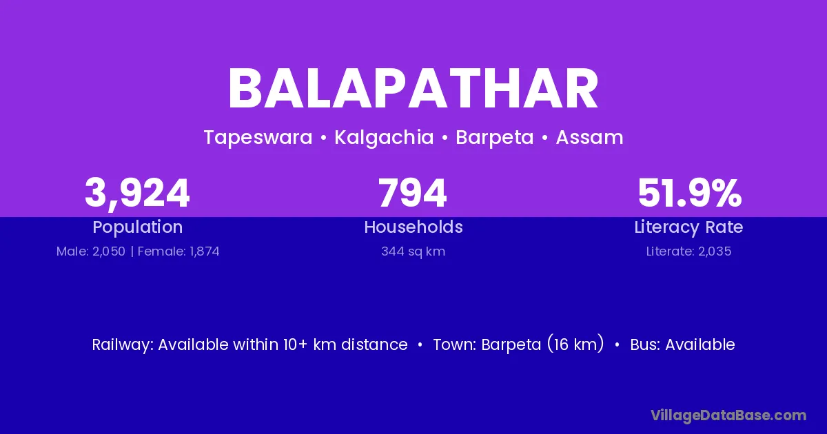 Barpeta (16 km) is the nearest town to Balapathar village for major economic activities and is located approximately 16 km away.