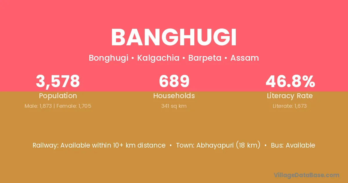 Abhayapuri (18 km) is the nearest town to Banghugi village for major economic activities and is located approximately 18 km away.