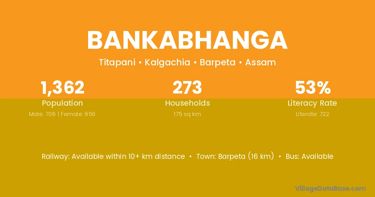 Barpeta (16 km) is the nearest town to Bankabhanga village for major economic activities and is located approximately 16 km away.