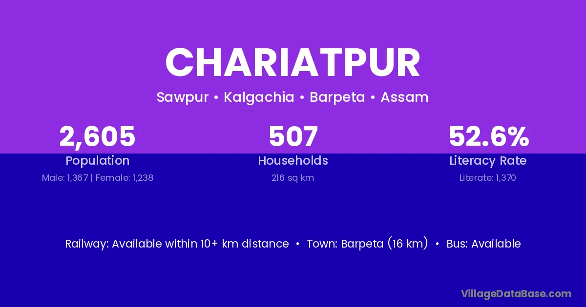 Barpeta (16 km) is the nearest town to Chariatpur village for major economic activities and is located approximately 16 km away.