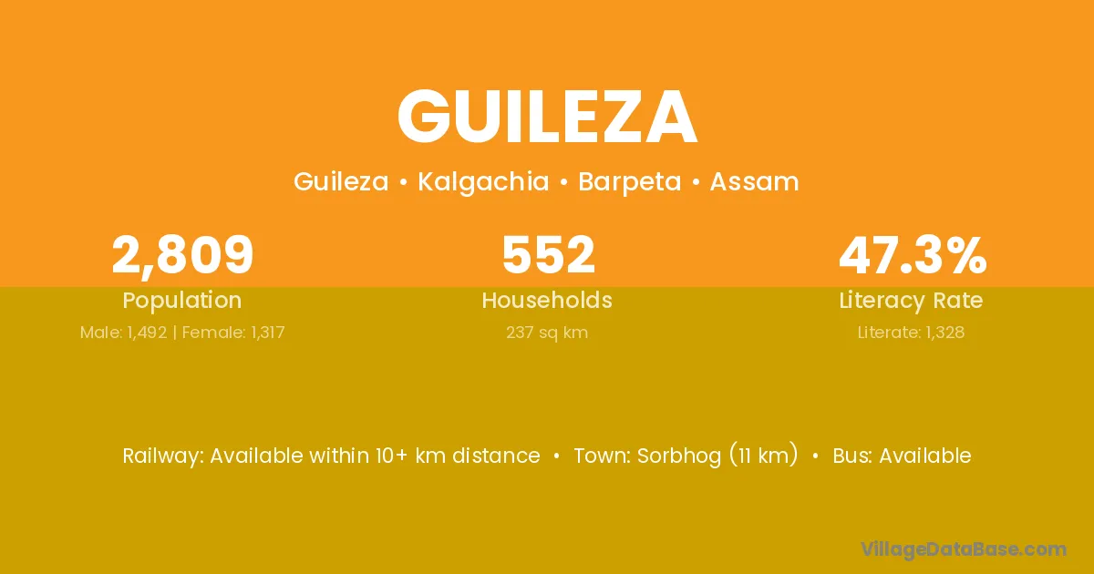 Sorbhog (11 km) is the nearest town to Guileza village for major economic activities and is located approximately 11 km away.